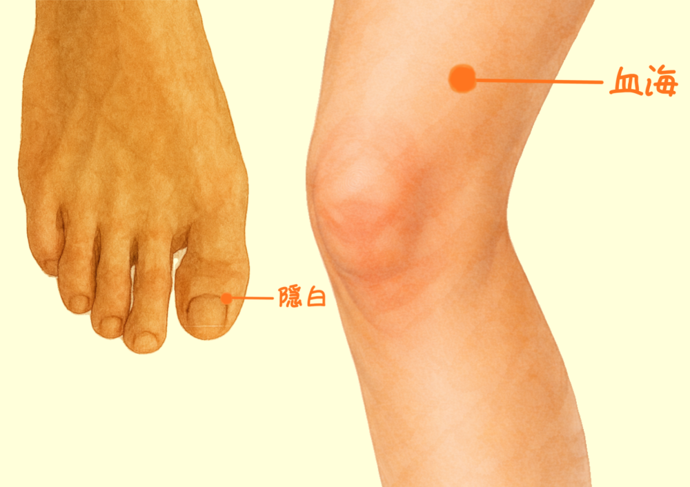 脾の経絡上のツボであり、脾の力を強め血を漏れないようにする。